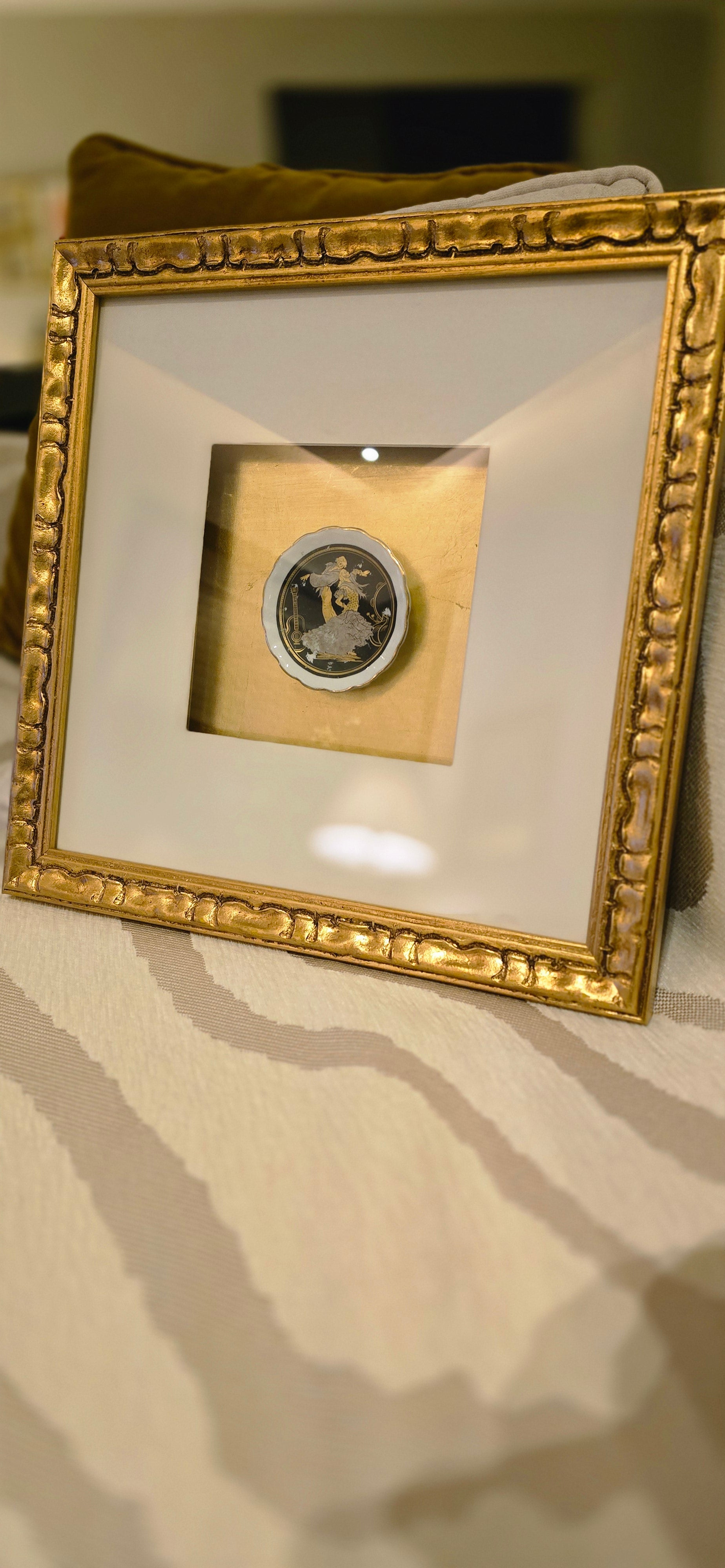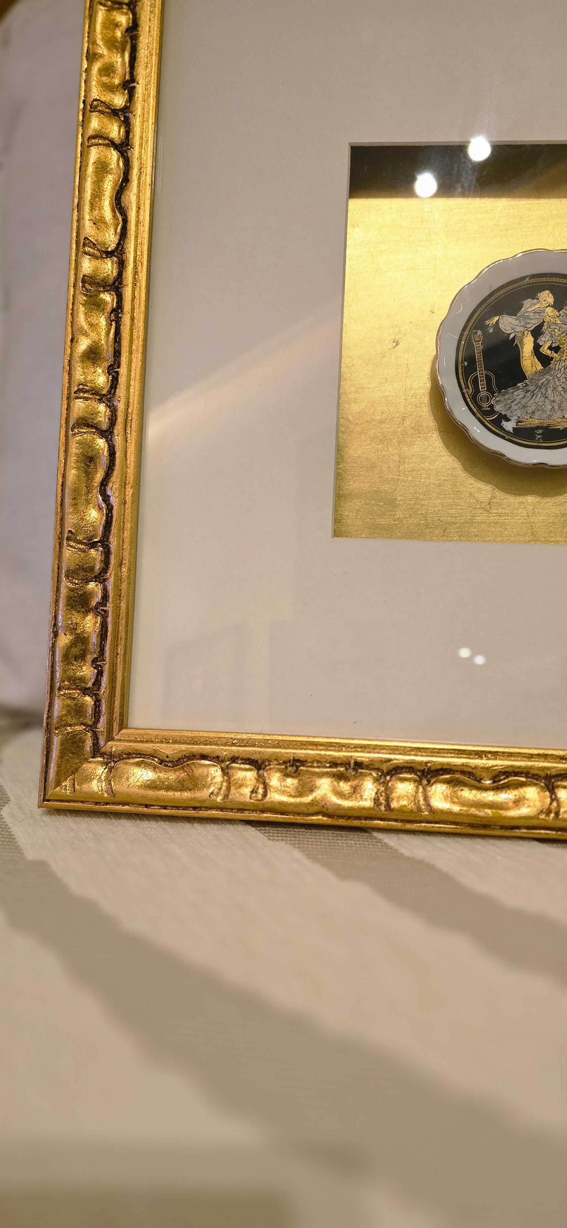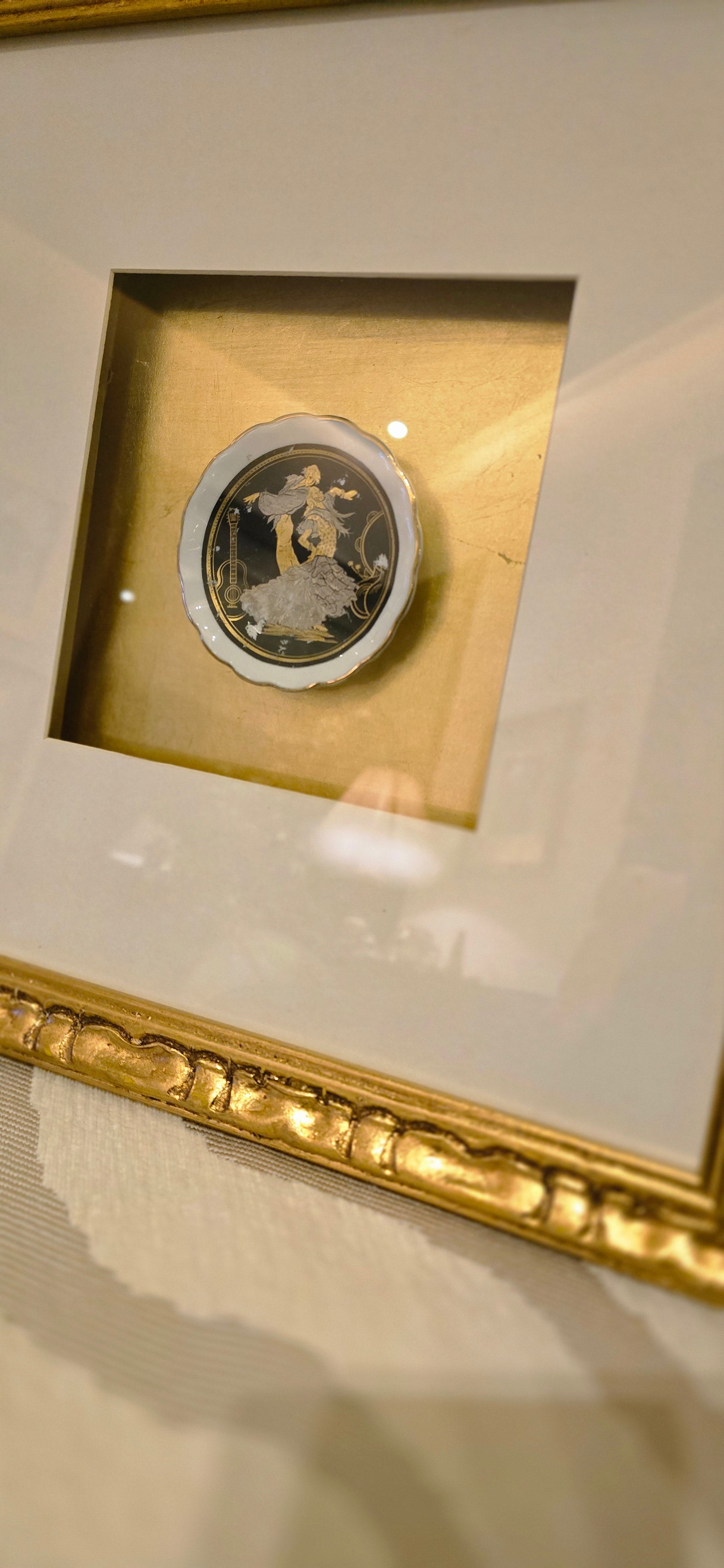 • Artwork is 10cms plate, vintage ceramic Spanish dancers plate. 24K Gold and silver with black and white base